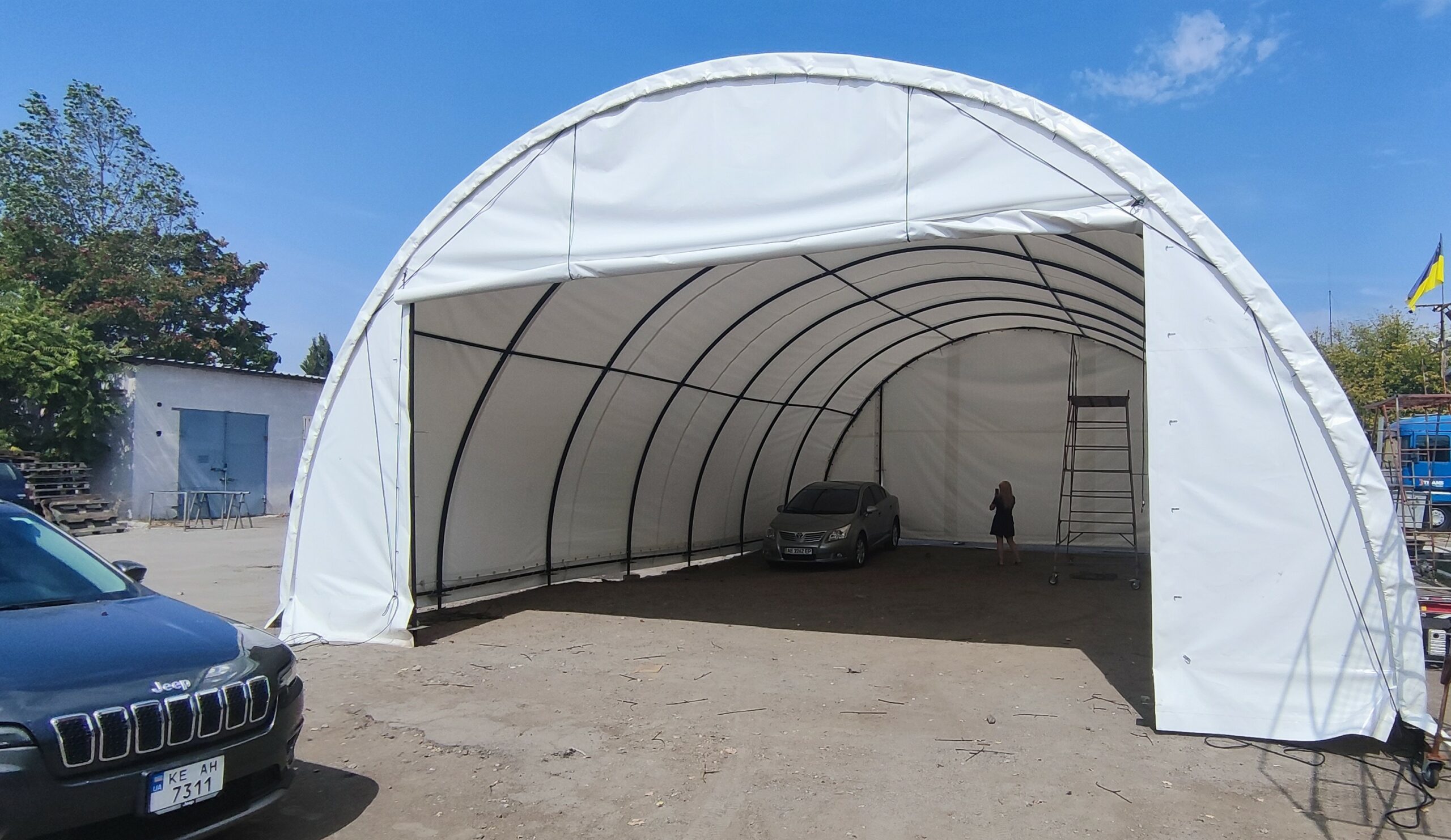 Это универсальная палатка, которую мы производим серийно. Палатка предназначена для использования как в полевых условиях для военных, медиков, строителей (устройства жилья, столовой, учебного центра) так и как дополнительное помещение для мастерской, склада, гаража и других целей. Благодаря высоте 5 метров, в этот ангар спокойно вмещается любой грузовик, или другая техника. Относительно легкий каркас обеспечивает возможность быстрого монтажа/демонтажа палатки, что позволяет использовать палатку как мобильное помещение. Крыша и стены изготовлены из ПВХ ткани плотностью 650 г/м2. Для этих тканей тканей характерна высокая механическая прочность, длительная эксплуатация изделий, а также устойчивость к выгоранию и загрязнениям. Они могут эксплуатироваться при диапазоне колебаний температур от -40 до +70 градусов Цельсия. Тентовые ткани обладают рядом характеристик, благодаря которым обладают высокой долговечностью. Текстиль изготовлен из 100% полиэстера высокой прочности, покрыт высококачественным ПВХ с обеих сторон, а также защитным слоем лака. Это обеспечивает защиту от влаги, стойкость к ветровым нагрузкам, выгоранию, перепадам температуры. Срок службы тента из ПВХ ткани более 10 лет при активной эксплуатации.