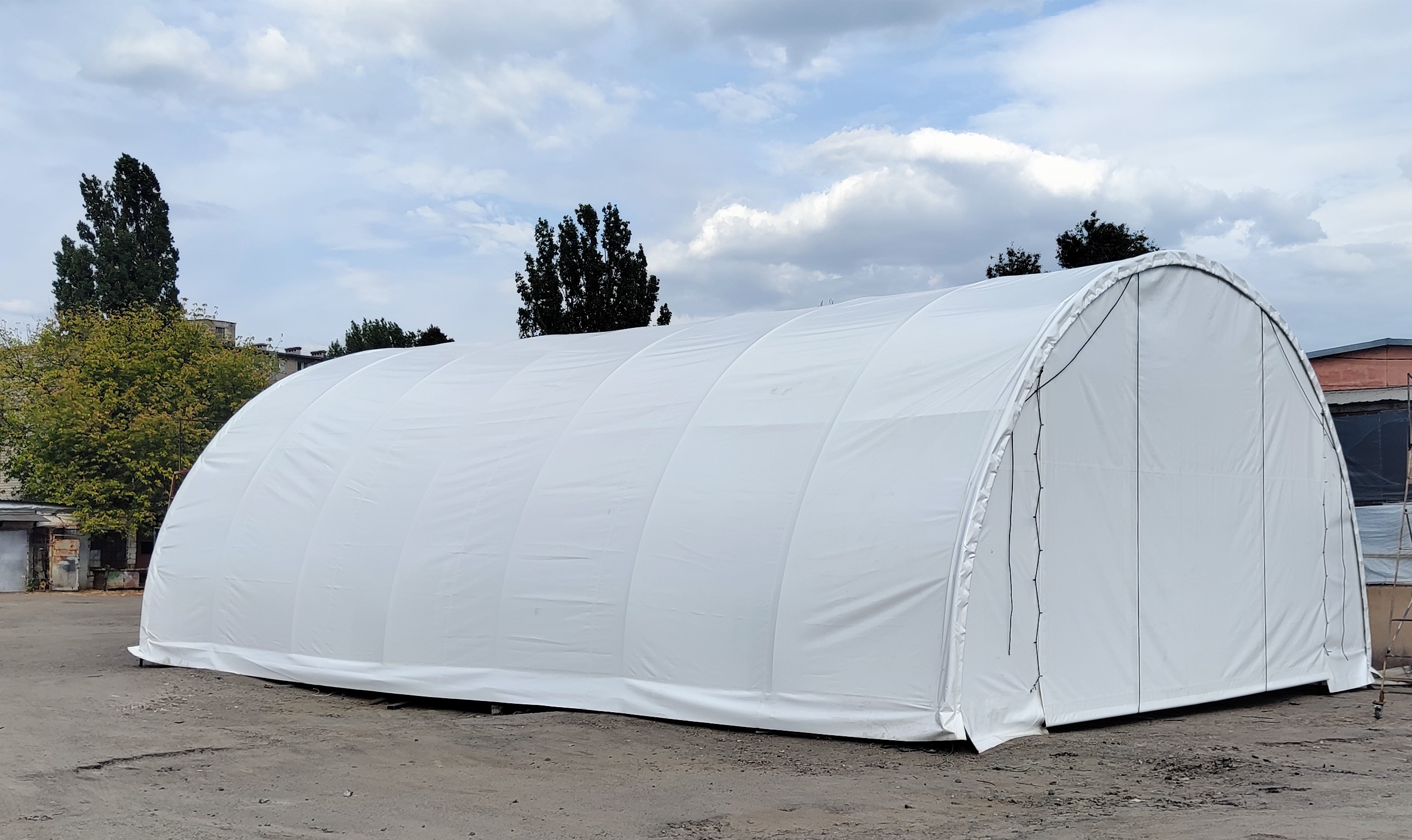 Это универсальная палатка, которую мы производим серийно. Палатка предназначена для использования как в полевых условиях для военных, медиков, строителей (устройства жилья, столовой, учебного центра) так и как дополнительное помещение для мастерской, склада, гаража и других целей. Благодаря высоте 4 метра, в этот ангар спокойно вмещается любой грузовик, или другая техника. Относительно легкий каркас обеспечивает возможность быстрого монтажа/демонтажа палатки, что позволяет использовать палатку как мобильное помещение. Крыша и стены изготовлены из ПВХ ткани плотностью 650 гр/м2. Для этих тканей тканей характерна высокая механическая прочность, длительная эксплуатация изделий, а также устойчивость к выгоранию и загрязнениям. Они могут эксплуатироваться при диапазоне колебаний температур от -40 до +70 градусов Цельсия. Тентовые ткани обладают рядом характеристик, благодаря которым обладают высокой долговечностью. Текстиль изготовлен из 100% полиэстера высокой прочности, покрыт высококачественным ПВХ с обеих сторон, а также защитным слоем лака. Это обеспечивает защиту от влаги, стойкость к ветровым нагрузкам, выгоранию, перепадам температуры. Срок службы тента из ПВХ ткани более 10 лет при активной эксплуатации.
