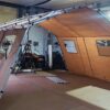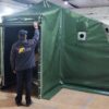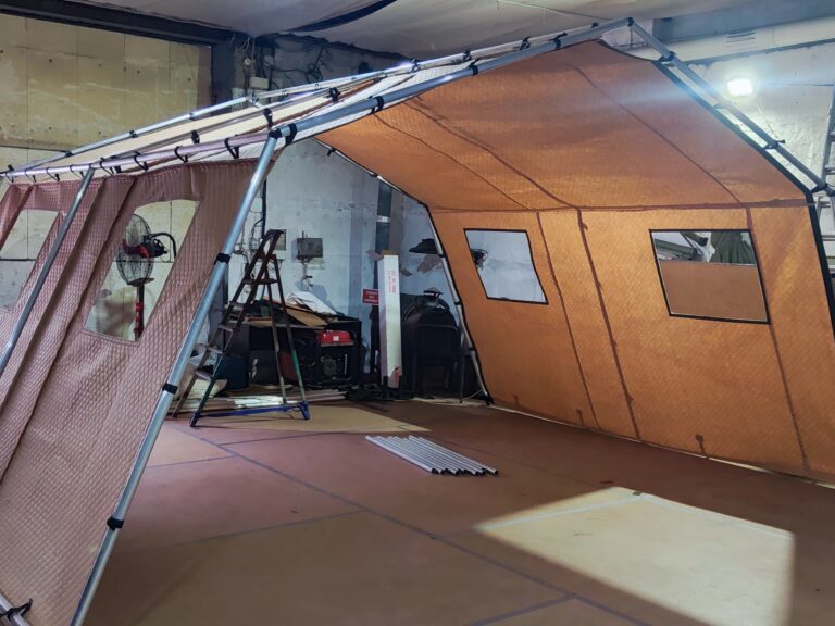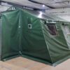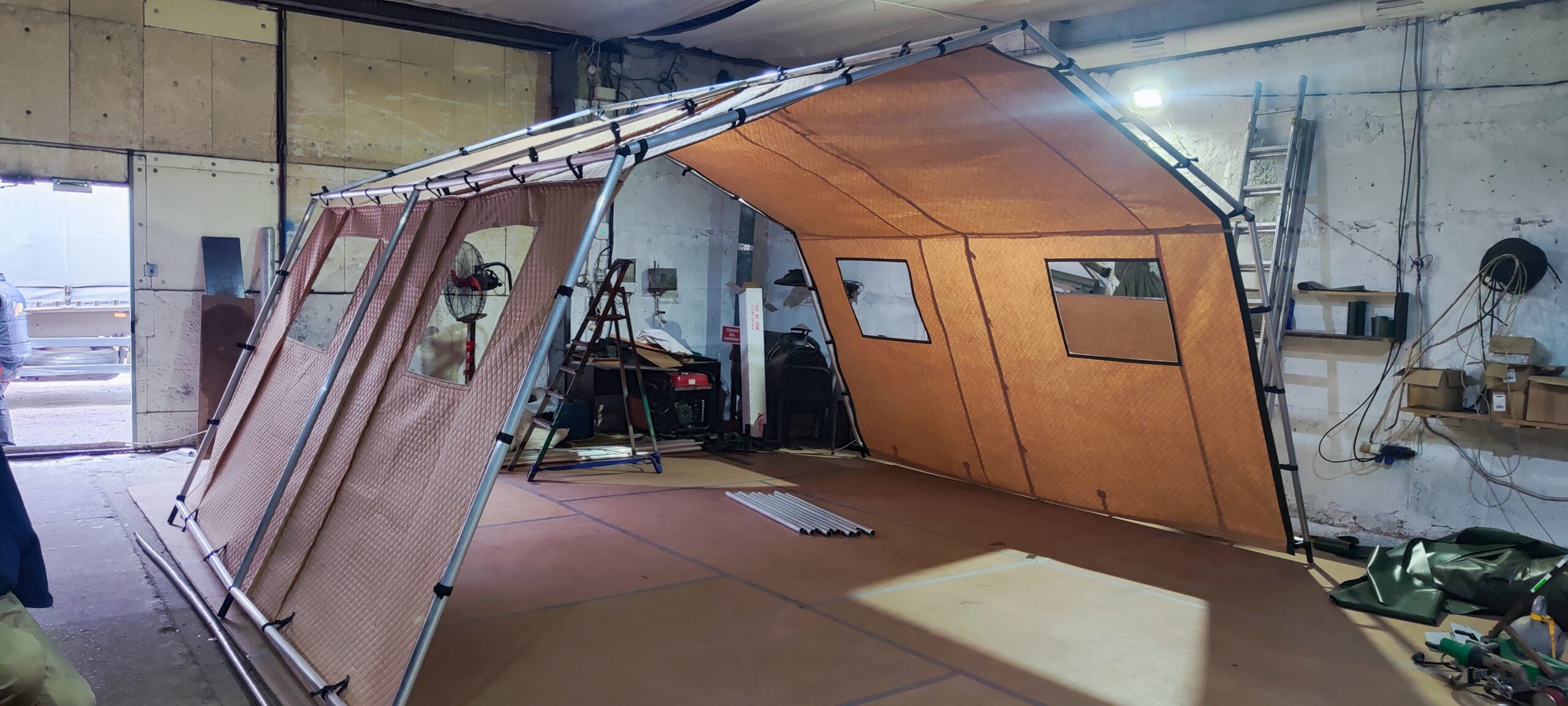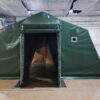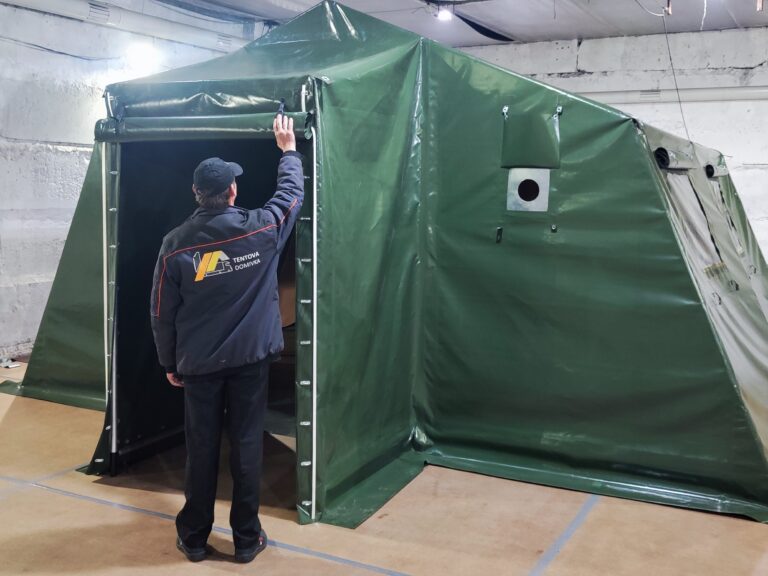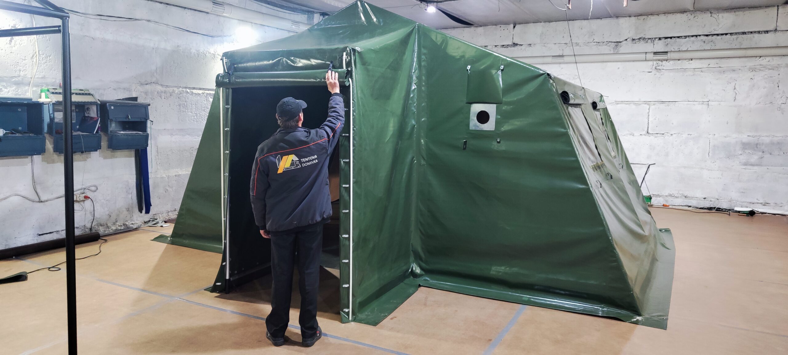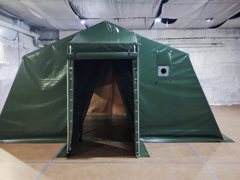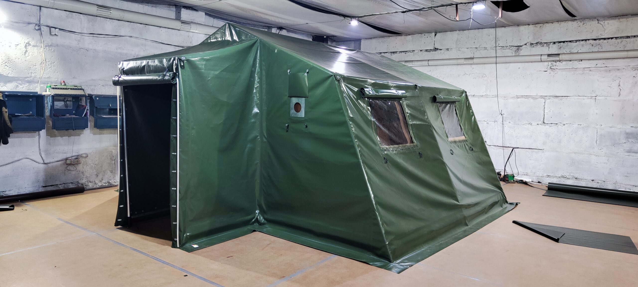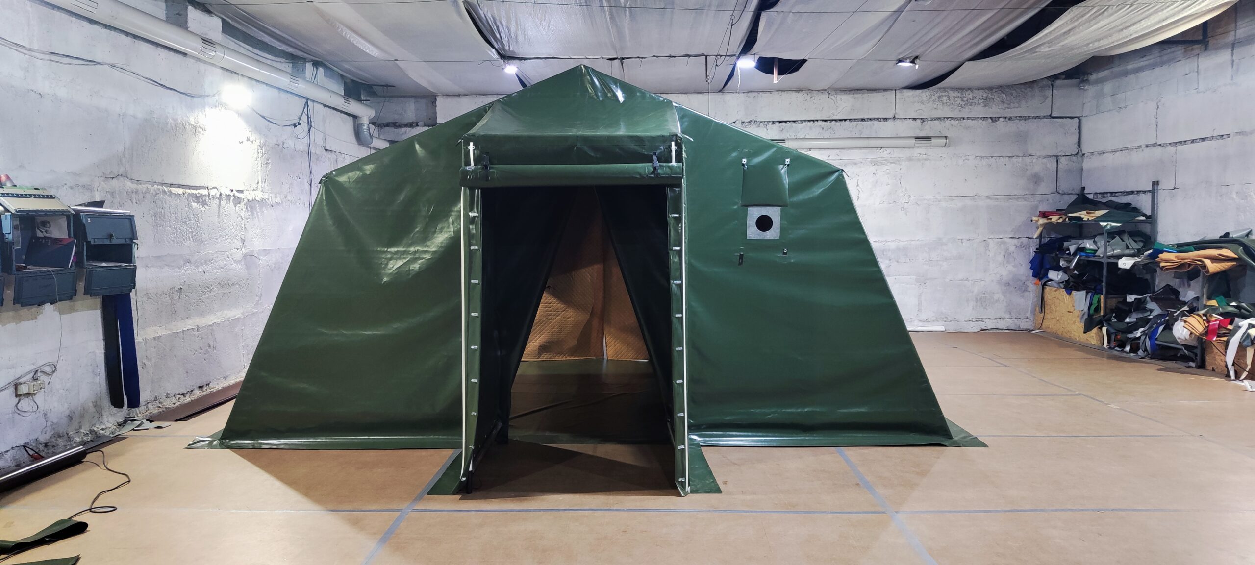 Эта палатка разработана МО Украины в 2021 году. Это современная и удобная модель палатки, изготовленная по всем требованиям и спецификациям. Палатка предназначена для использования как в полевых условиях для военных, медиков, строителей, так и как дополнительное помещение для мастерской, склада, гаража и других целей. Относительно легкий каркас обеспечивает возможность быстрого монтажа/демонтажа палатки, что позволяет использовать палатку как мобильное помещение. Крыша и стены изготовлены из ПВХ ткани плотностью 650 гр/м2. Для этих тканей тканей характерна высокая механическая прочность, длительная эксплуатация изделий, а также устойчивость к выгоранию и загрязнениям. Они могут эксплуатироваться при диапазоне колебаний температур от -40 до +70 градусов Цельсия. Тентовые ткани обладают рядом характеристик, благодаря которым обладают высокой долговечностью. Текстиль изготовлен из 100% полиэстера высокой прочности, покрыт высококачественным ПВХ с обеих сторон, а также защитным слоем лака. Это обеспечивает защиту от влаги, стойкость к ветровым нагрузкам, выгоранию, перепадам температуры. Срок службы тента из ПВХ ткани более 5-7 лет при активной эксплуатации. Каркас разработан таким образом, что не требует дополнительных растяжек для его развертывания и эксплуатации.