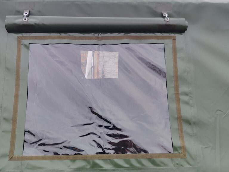 Прозрачные окна ПВХ закрываются на молнию и имеют москитную сетку, а также наружные клапаны.