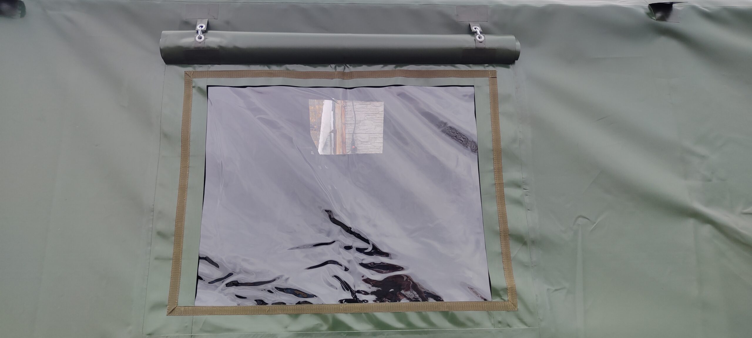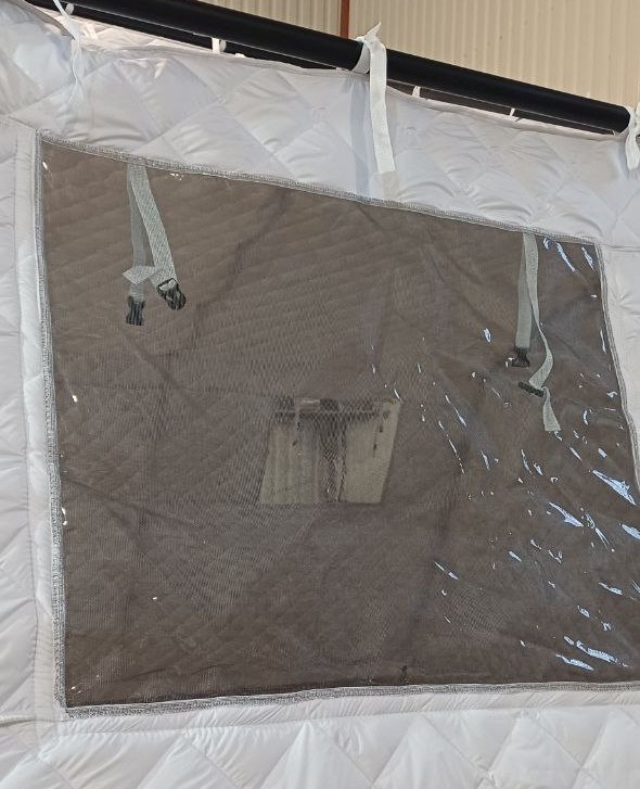 Прозрачные окна ПВХ закрываются на молнию и имеют москитную сетку, а также наружные клапаны.