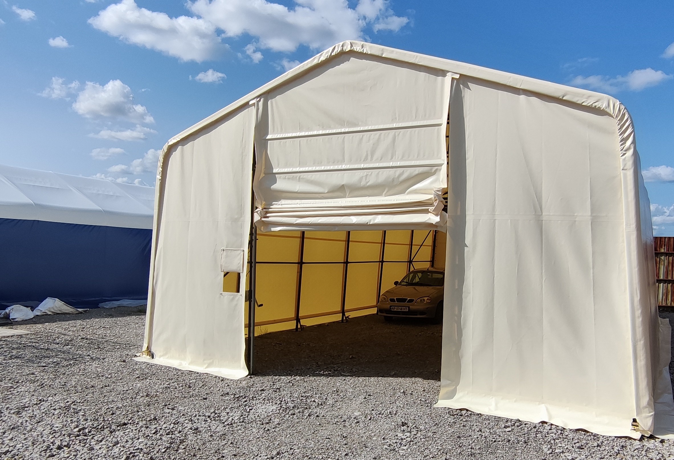 За счёт стен с небольшим наклоном и высотой от 2 до 4 метров этот миниангар будет иметь большую площадь, чем классический аналог с двускатной крышей, а так же будет выдерживать большую ветровую нагрузку. Легкосборный каркас, возможность быстро смонтировать на любой поверхнорсти. Используется как мини ангар для хранения, ремонта, цеха или животноводчества. Длина от 12 до 30 метров.